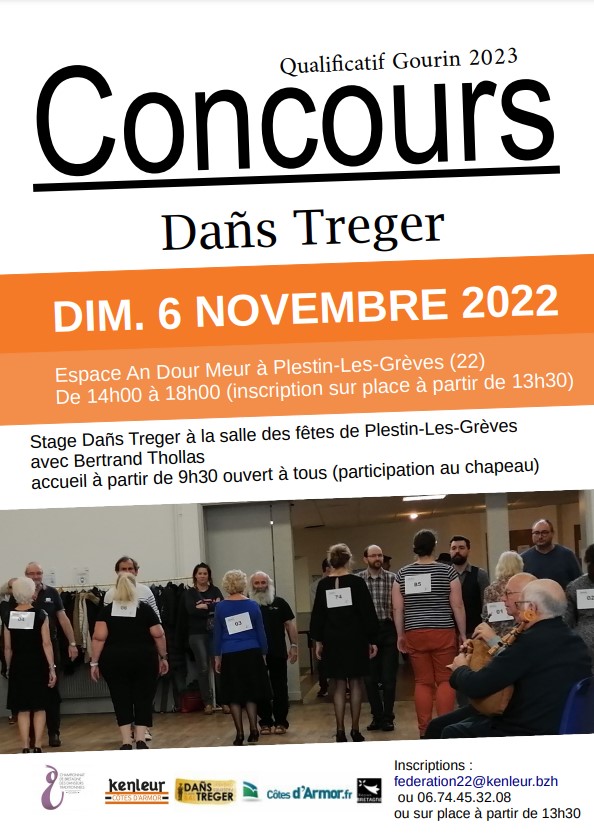 Venez nombreux au stage et au concours Dañs Treger (qualificatif pour la finale de Gourin en 2023) ! Rendez-vous le dimanche 6 novembre à Plestin-les-Grèves :