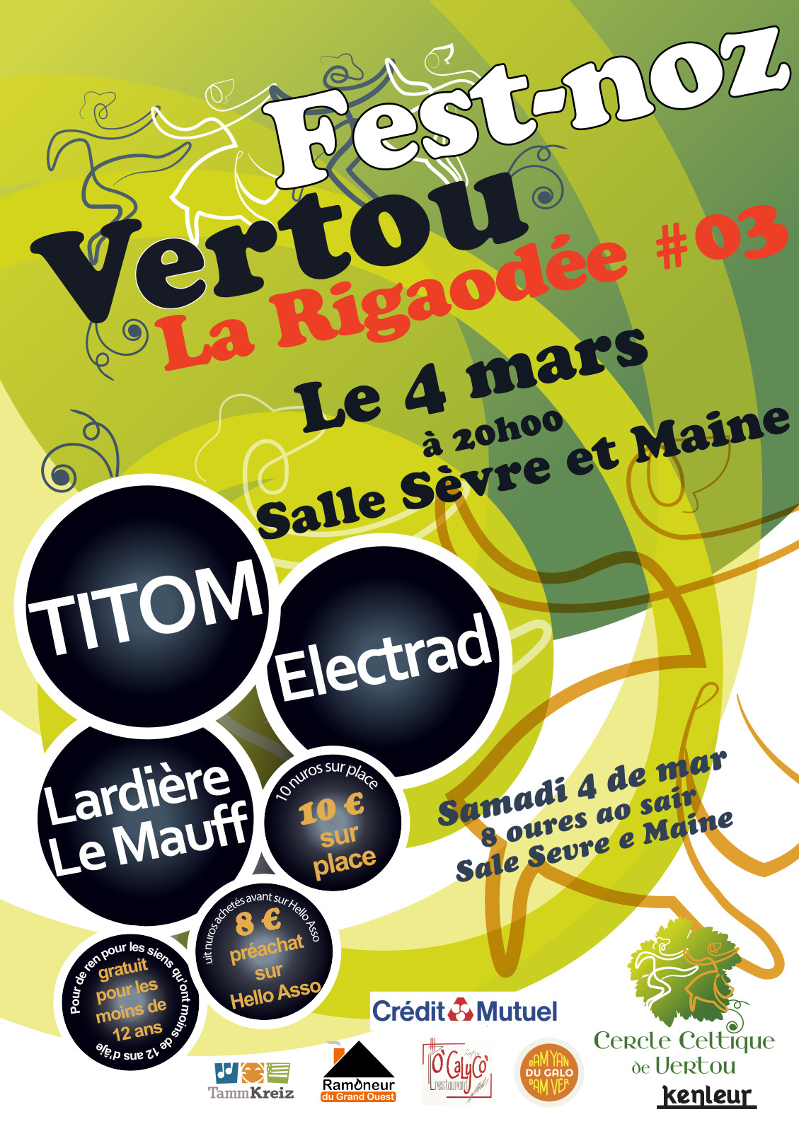 Le cercle celtique de Vertou organise le samedi 4 mars, à la salle Sèvre et Maine à Vertou, La Rigaodée #03, son grand fest-noz annuel, avec les groupes TITOM, [E]lectrad et Lardière/Le Mauff.