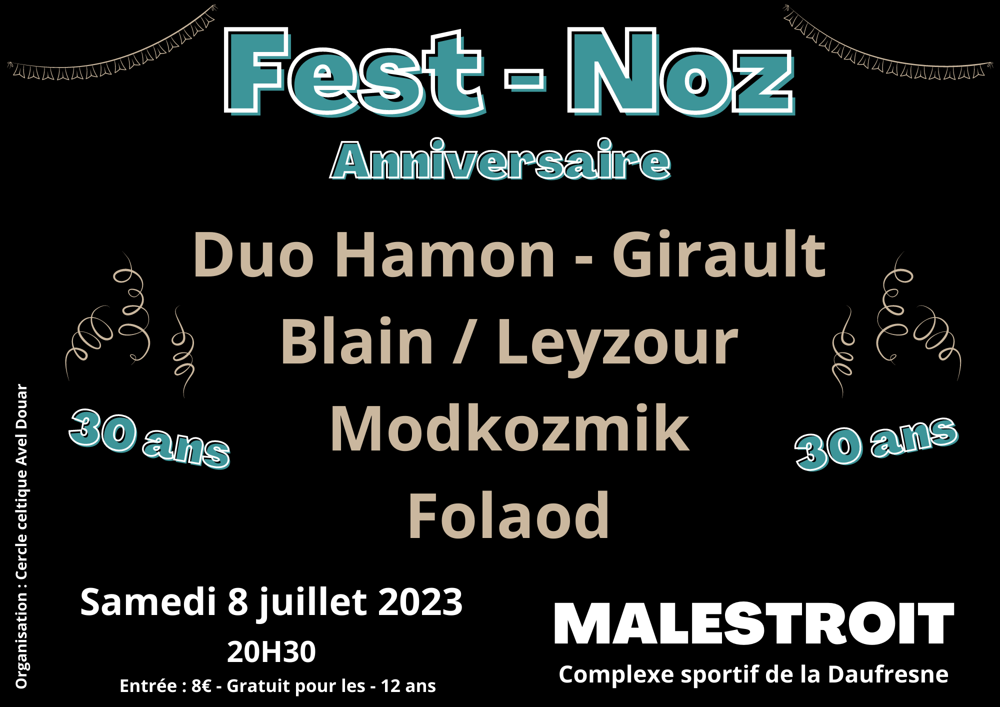 Le cercle celtique de Malestroit fête ses 30 ans. Dans le cadre de son week-end anniversaire, il organise un fest-noz le samedi 8 juillet 2023 à 20h30, au complexe sportif de la Daufresne à Malestroit.