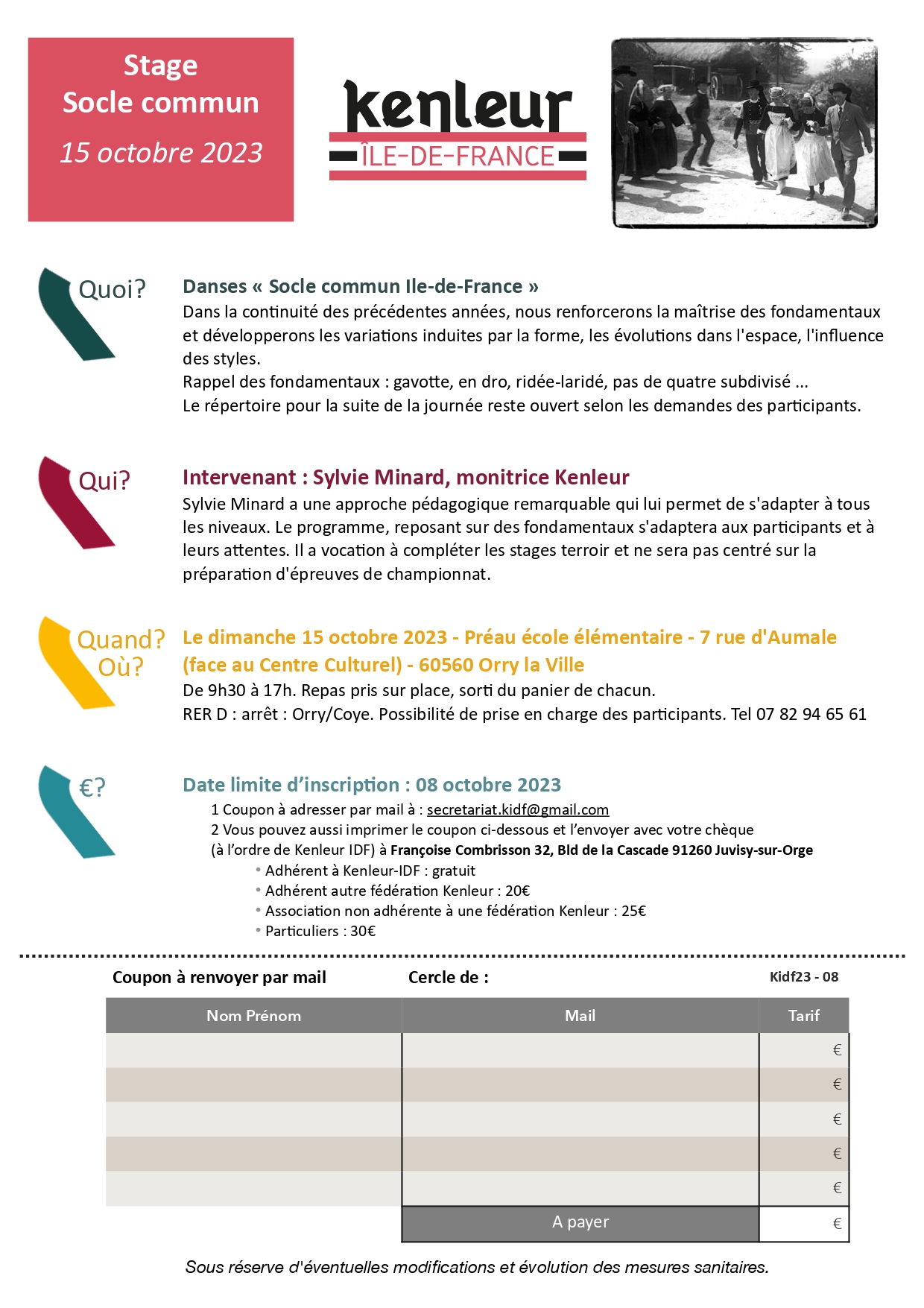 Rappel des fondamentaux : gavotte, en dro, ridée-laridé, pas de quatre subdivisé … Le répertoire pour la suite de la journée reste ouvert selon les demandes des participants.