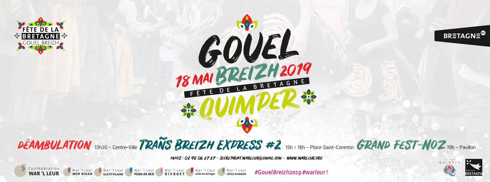 Rassembler, fédérer, valoriser la Bretagne dans toute sa créativité autour d’un évènement festif, convivial, intergénérationnel et ambitieux, tel est notre volonté commune avec la Gouel Breizh – Fête de la Bretagne. Portée depuis 2009 par le Conseil régional de Bretagne, cet évènement fêtera en 2019 son dixième anniversaire. Après son 50e en 2017, qui a été une réussite sur tous les plans (humain, artistique, organisationnel et médiatique), la confédération War ‘l Leur en partenariat avec la Mairie de Quimper souhaite inscrire cette manifestation comme un temps fort de la vie culturelle bretonne de Quimper.