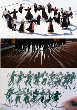 Les lettres forment une chaîne de danseurs en suspension, dont certains touchent le sol en rythme régulier.