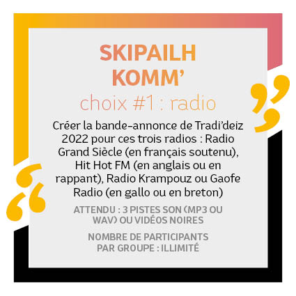 Choix #1 : Séduisez les foules pour Tradi’Deiz 2022 : les trois grandes radios de l’an prochain préparent déjà leur programmation et font appel à vos services pour créer des bandes-annonces percutantes et pertinentes dans le respect de leur ligne éditoriale.