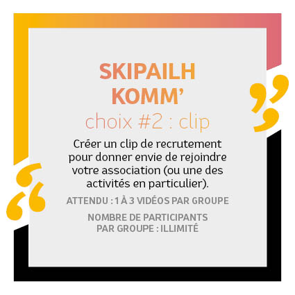 Choix # 2 : Votre asso a aussi besoin de vos services pour recruter de nouveaux adhérents. Soit pour l’asso en général, soit pour une de ses sections : à votre guise ! La vidéo est à destination des réseaux sociaux, donc pas trop longue, et faites bien attention à vous adapter à la cible que vous visez. Cela peut être sous forme de témoignage, de publicité, de montage vidéo avec slogans…