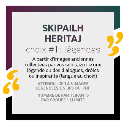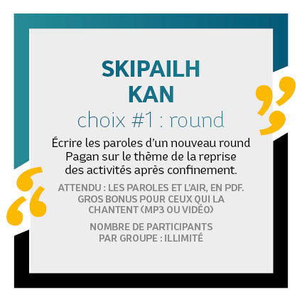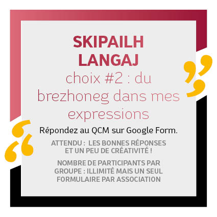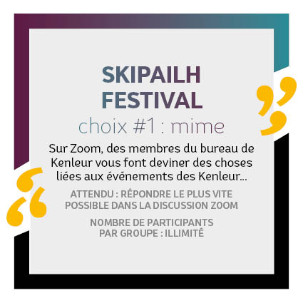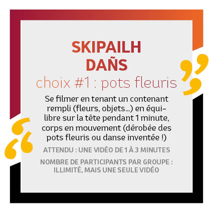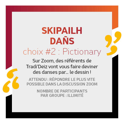 Comme pour le Pictionary de la Skipailh Dañs, rendez-vous sur Zoom pour deviner les sujets mimés et répondre le plus vite possible dans la discussion Zoom : vous pouvez participer à plusieurs, vous pouvez donner plusieurs réponses, mais seule la bonne réponse la plus rapide sera prise en compte !