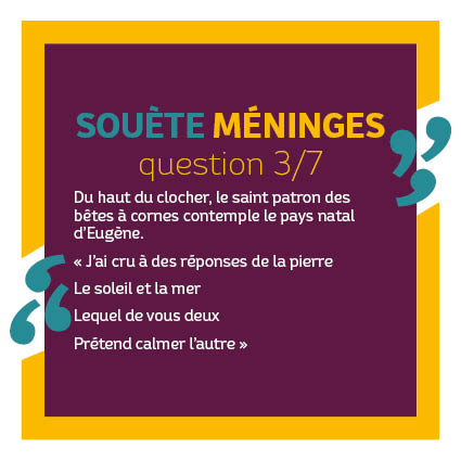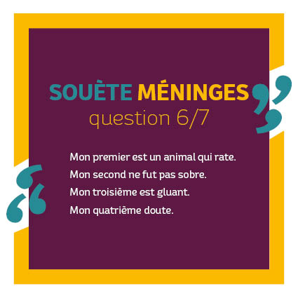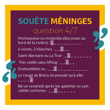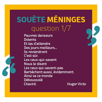 – Souète Méninges : à partir de 9h46 et toutes les 45 minutes environ, 7 questions qui font réfléchir