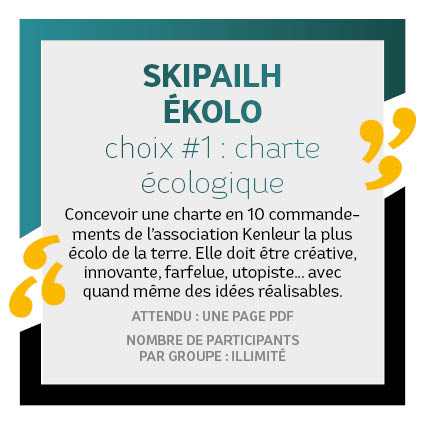 On compte sur votre fibre écolo et sur vos plus belles idées innovantes et bienveillantes pour développer les bonnes pratiques à Kenleur : défense des droits, des causes, gouvernance, énergie, accueil et accessibilité, zéro déchet, restauration – alimentation, transports – mobilités, hébergement…