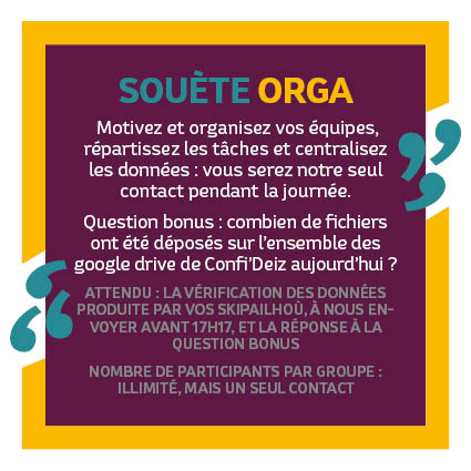 Pour une organisation bien huilée, nous comptons sur les Souètes Orga pour distribuer les rôles, centraliser les productions et répondre à la question bonus. Vous avez toute la journée pour faire le lien entre les membres de vos équipes, faire le meilleur casting possible, croire en les capacités de chacun et tenir le chronomètre !