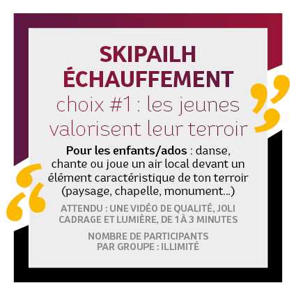 - Pour les enfants/ados : danse, chante ou joue un air local devant un élément caractéristique de ton terroir (paysage, chapelle, monument…). On attend de vous une vidéo de qualité, joli cadrage et lumière, de 1 à 3 minutes maximum. Nombre de participants par groupe : illimité.