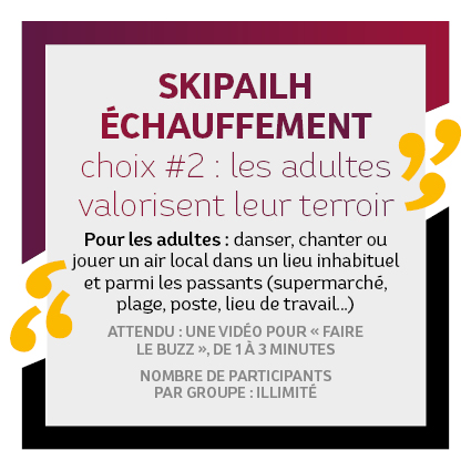 - Pour les adultes : danser, chanter ou jouer un air local dans un lieu inhabituel et parmi les passants (supermarché, parc, poste, lieu de travail…) (attention à respecter les gestes barrière). On attend de vous une vidéo pour « faire le buzz », de 1 à 3 minutes maximum. Nombre de participants par groupe : illimité.