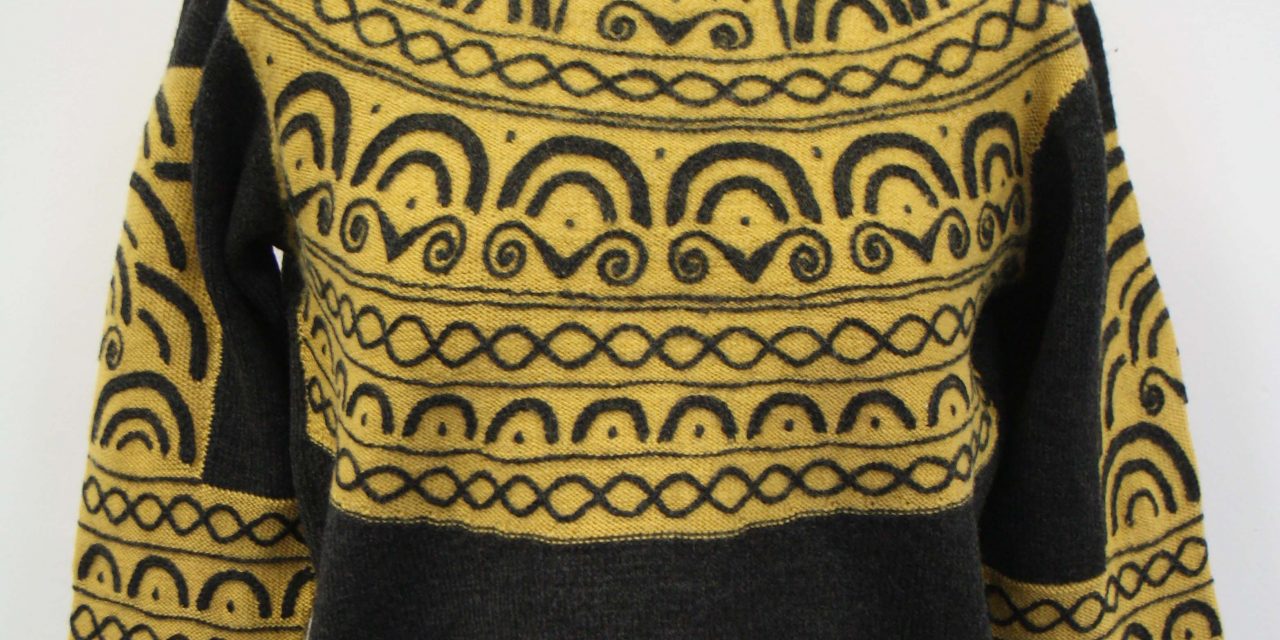 Depuis quelques temps déjà, Kenleur réfléchit à sa politique d’acquisition textile. Les réserves n’étant pas extensibles, il faut faire des choix sur les pièces qui intègrent les collections. Si la rareté ou l’ancienneté de certaines pièces peuvent être des critères indiscutables, quel regard porter sur les pièces plus contemporaines, qui feront peut-être le patrimoine de demain ? Ce pull en laine, tricoté et porté par Suzanne Brien (1918-2015), a été réalisé au milieu des années 1960 en s’inspirant des motifs traditionnels du Pays bigouden. Même si cette pièce, relativement récente, n’est pas à proprement parler un vêtement traditionnel, elle trouve légitiment sa place dans notre collection textile, dans la mesure où elle s’inspire et réinterprète des motifs anciens qui, s’ils avaient perduré, auraient très certainement également évolué. En effet, dans le domaine du patrimoine culturel immatériel, rien n’est figé et tout est question de réinterprétation et de métissage.