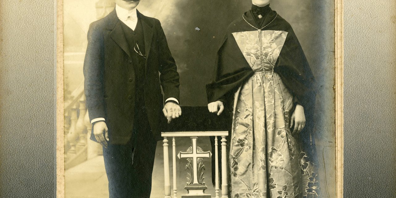 Le mobilier constitue un accessoire récurrent et indispensable pour les photographes. Il présente d’abord une fonction utilitaire (surtout au 19e siècle) : maintenir une posture alors que le temps de pose est relativement long. Le mobilier, sauf à de rares exceptions, est assez standardisé. On retrouve le plus souvent de hauts guéridons où l’on pose ses coudes, des dossiers de chaise, des rambardes, des tables et très souvent des prie-Dieu, comme sur cette photographie réalisée par Jean Inizan vers 1910. Jean Inizan dispose d’un vaste immeuble-atelier au 77-79, rue de Paris à Brest, qui deviendra plus tard la célèbre rue Jean Jaurès. Dans le très religieux Léon, le prie-Dieu occupe une place prépondérante. C’est même ici le sujet principal de la photographie. Il est placé exactement à 1/3 sur la verticale du cliché et exactement au centre, séparant symboliquement et matériellement les deux époux, nous faisant presque oublier les beaux reflets du tablier moiré de la mariée.