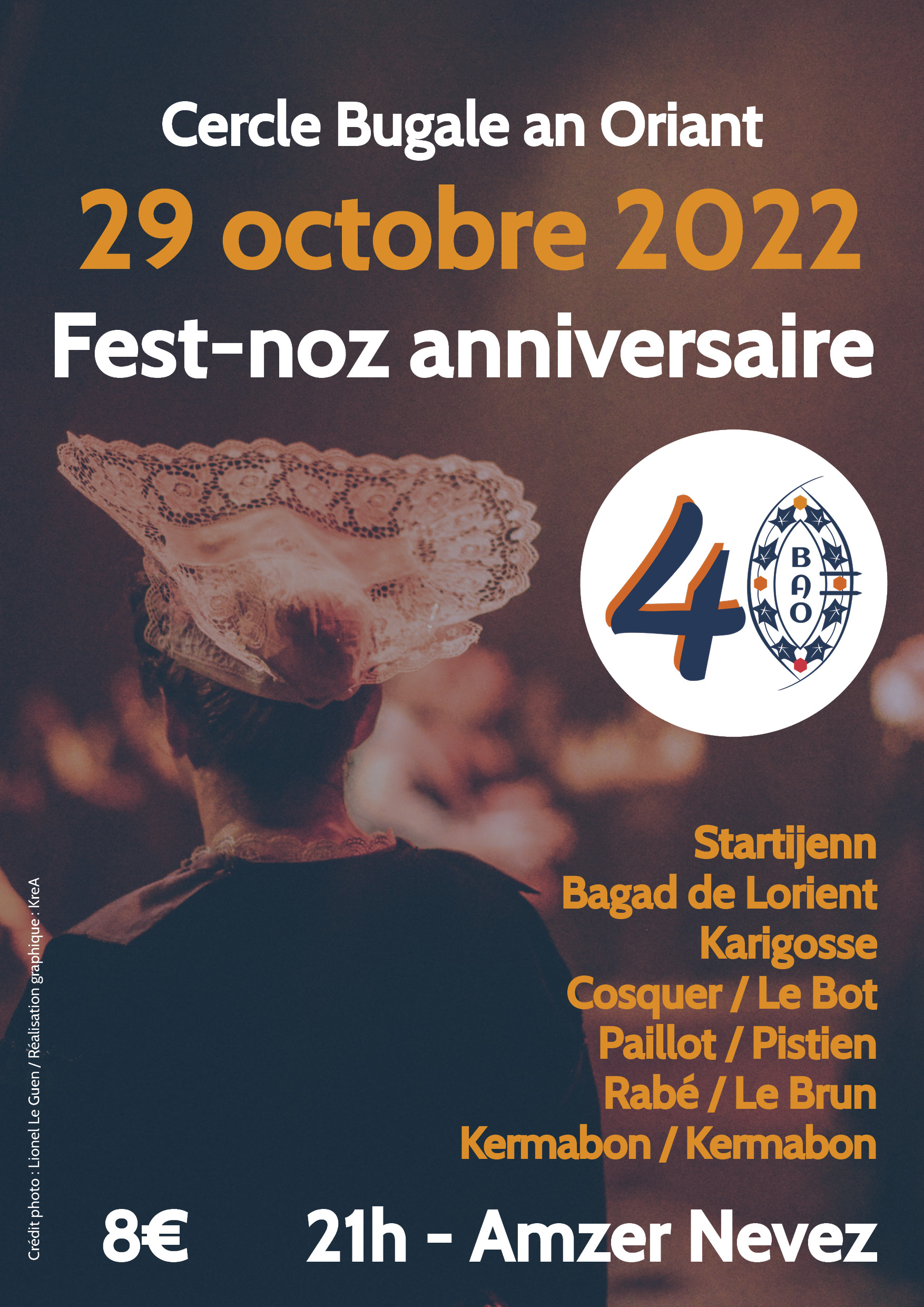 Le samedi 29 Octobre 2022, le Cercle Celtique Bugale An Oriant fête ses 40 ans d’existence avec un fest-Noz au centre culturel d’Amzer Nevez à Ploemeur (56) – Venez nombreux !