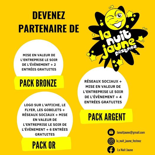 La Nuit Jaune cherche des partenaires ! 03/10/22 | Le coin des adhérents, Non classé Pour ses 25 ans, la Nuit Jaune d’Elliant cherche des partenaires ! Entreprises, associations ou bien encore particuliers : venez soutenir leur projet !
