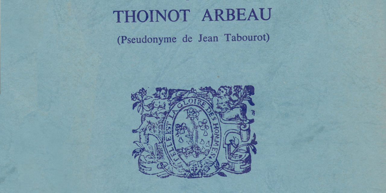 L’auteur Jehan Tabourot vous propose, sous son pseudonyme et anagramme de Thoinot Arbeau, « un traité en forme de dialogue par lequel toutes personnes peuvent facilement apprendre et pratiquer l’honnête exercice des danses ». C’est en l’an 1588, que le Privilège du Roy accorde au chanoine de la cathédrale de Langres, la publication de ses travaux. Cet ouvrage, imprimé en 1589, soit six ans avant son décès, est une copie de la première édition, dans son intégralité avec les ratures et les ajouts manuscrits ; il sera réédité nombre de fois de par le monde.