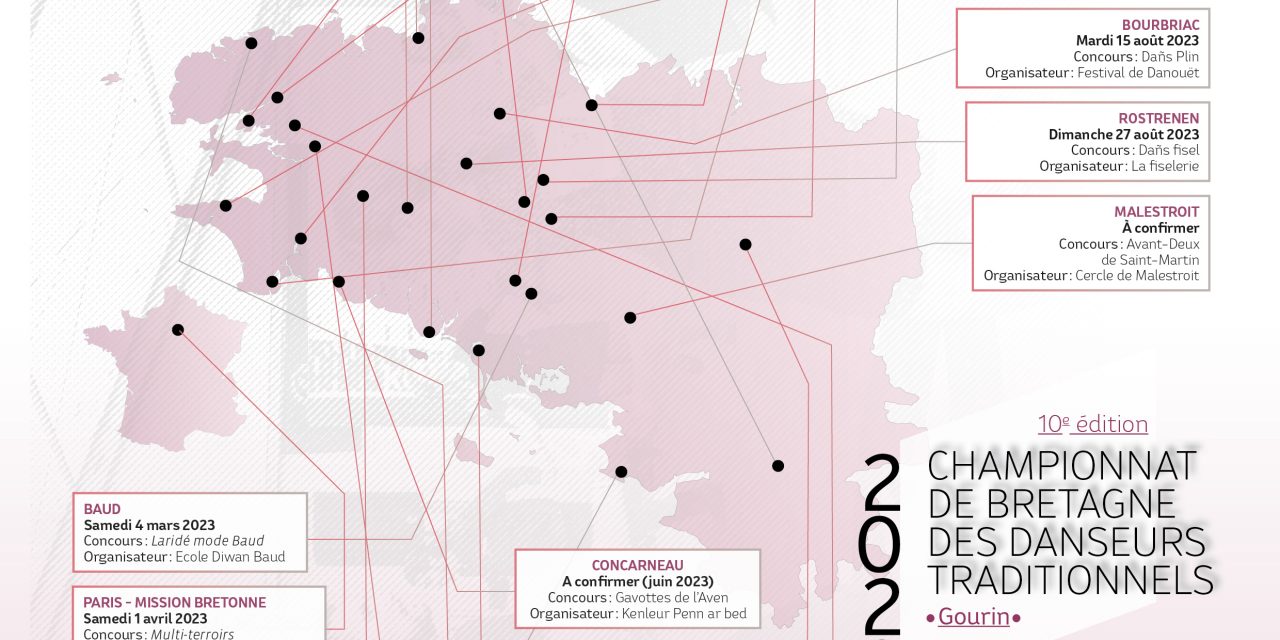 Découvrez la nouvelle carte des 27 concours qualificatifs 2022-2023 pour le championnat de Bretagne des danseurs et danseuses traditionnels ! Le tirage au sort des danses de la finale aura lieu le samedi 25 mars et la finale à Gourin le samedi 2 septembre. Ce sera la 10e édition de ce championnat !