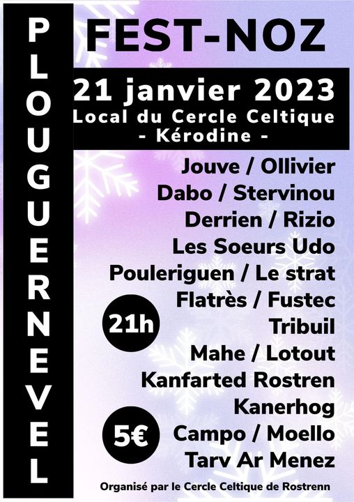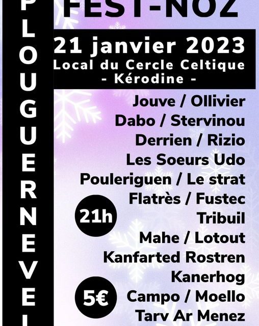 Le cercle celtique de Rostrenen organise son fest-noz annuel dans son local de Kerodine. Rendez-vous le 21 janvier prochain à partir de 21h ! Avec les Kanfarted Rostren, Les Sœurs Udo, Kanerhog, Mahé/Lotout et bien d’autres…