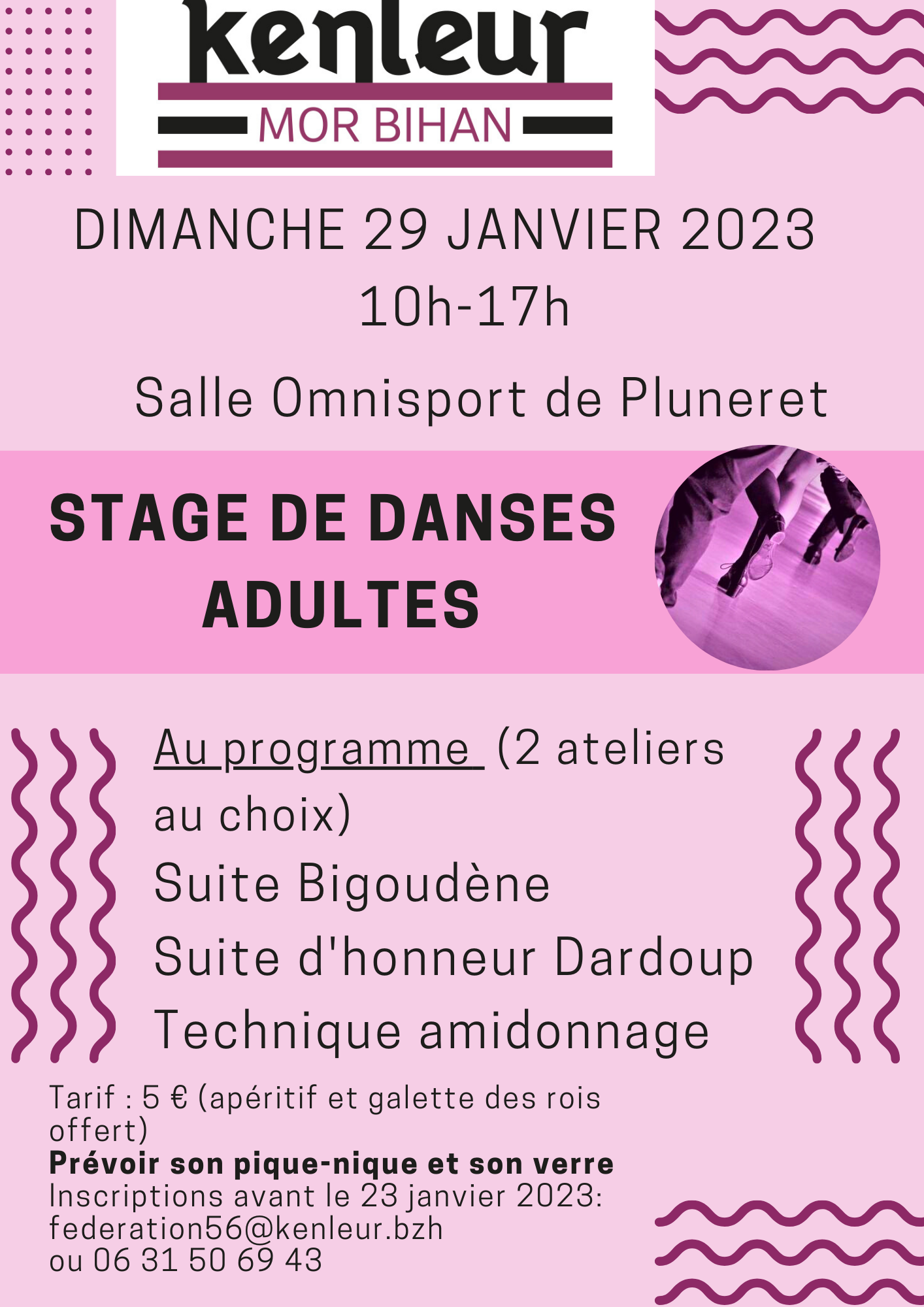 Au programme : suite bigoudène et suite d’honneur Dardoup. Tarif 5 €. (apéritif et galette des rois offerts). Prévoir son pique-nique et son verre.