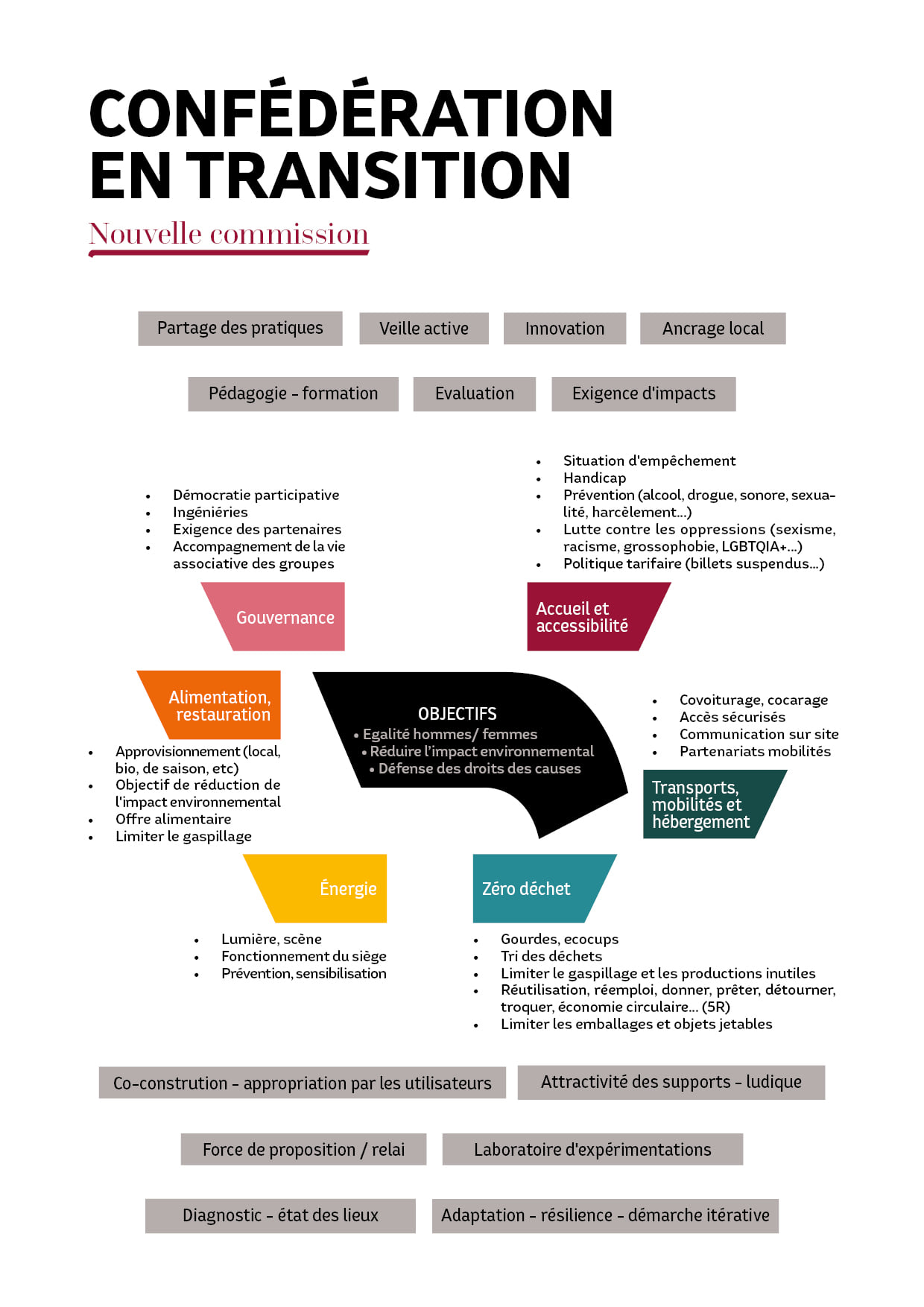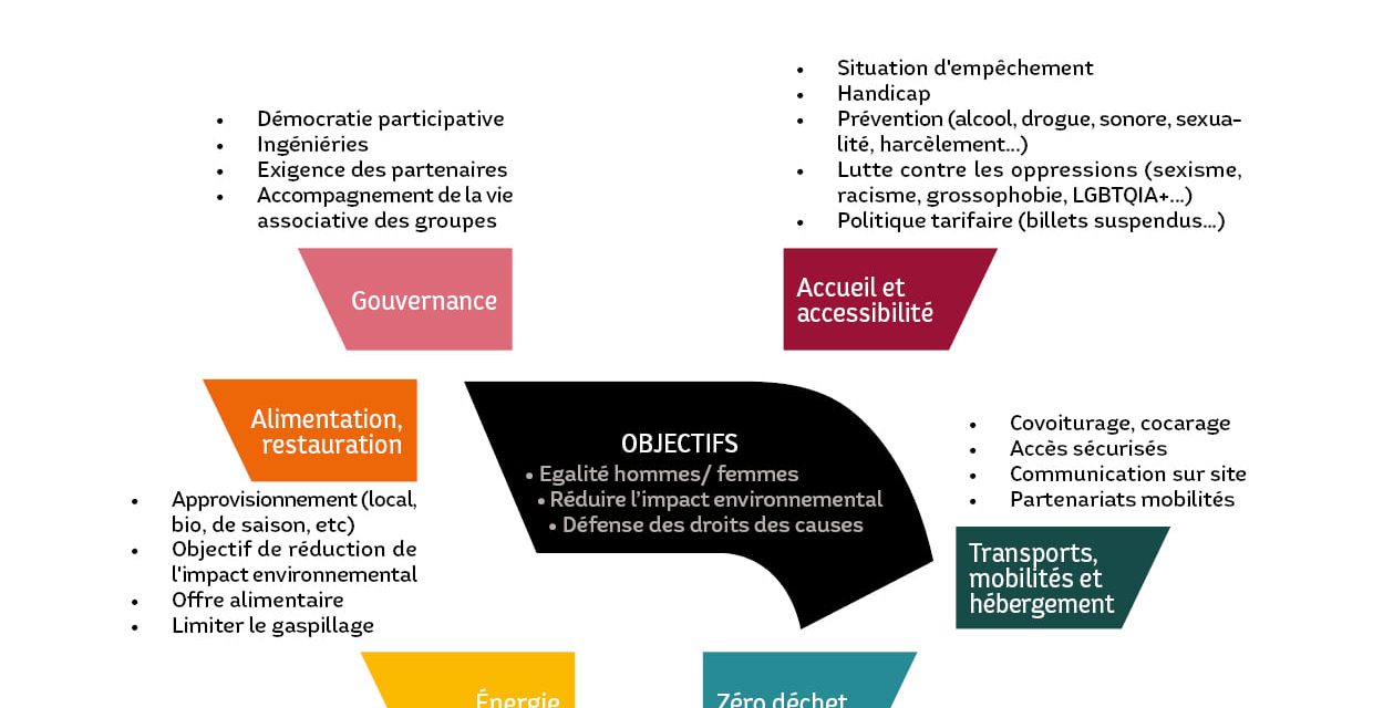 * Des ateliers en tables rondes pour approfondir les sujets et imaginer des pistes d’actions ensemble. Cinq tables au programme : Alimentation, restauration, zéro déchet // Energie, transport, mobilité, hébergement // Accueil et accessibilité // Égalité des genres et violences sexistes et sexuelles // Gouvernance des associations