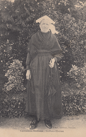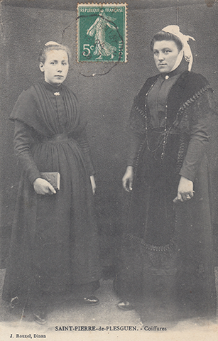 Carte postale de Saint-Pierre-de-Plesguen vers 1910, la femme à gauche porte une coiffe appelée “Petite Catiole”