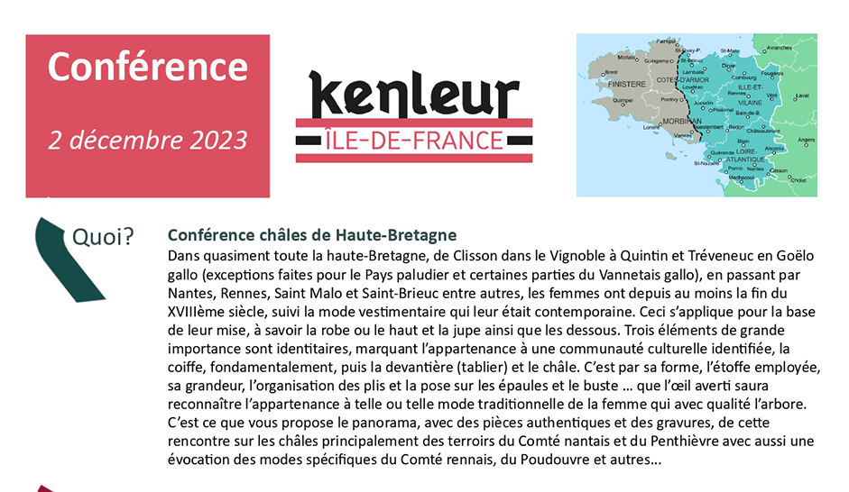 C’est ce que vous propose le panorama, avec des pièces authentiques et des gravures, de cette rencontre sur les châles principalement des terroirs du Comté nantais et du Penthièvre avec aussi une évocation des modes spécifiques du Comté rennais, du Poudouvre et autres.