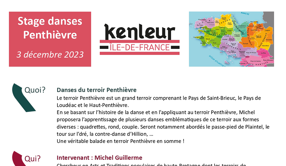 Seront notamment abordés le passe-pied de Plaintel, le tour sur l’dré, la contre-danse d’Hillion, etc..