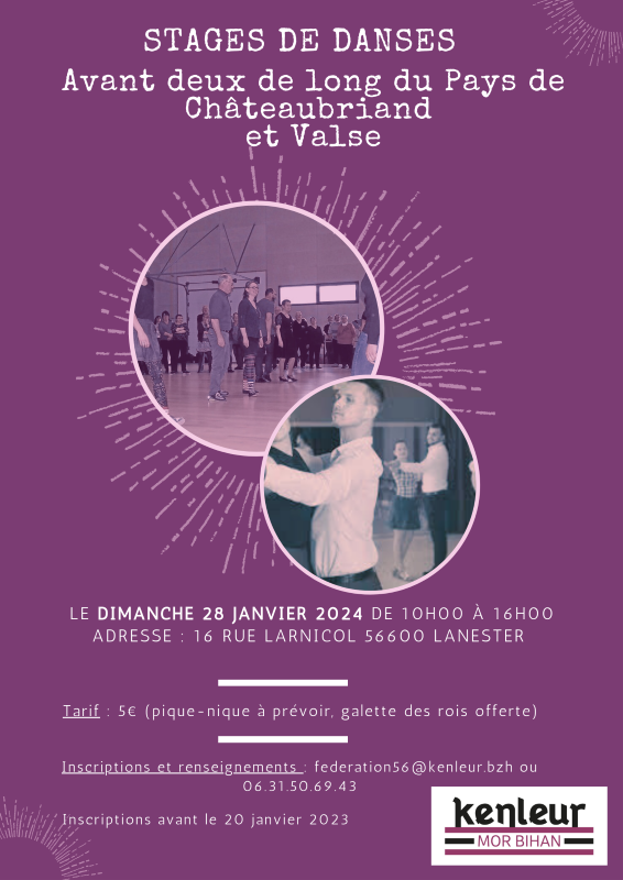 La fédération Kenleur MorBihan organise le dimanche 28 janvier 2024 un stage de danses de 10h00 à 16h00.