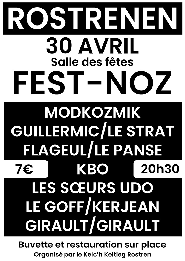 Kelc’h Keltieg Rostren vous propose un fest-noz le mardi 30 avril, et des spectacles le mercredi 1er mai.