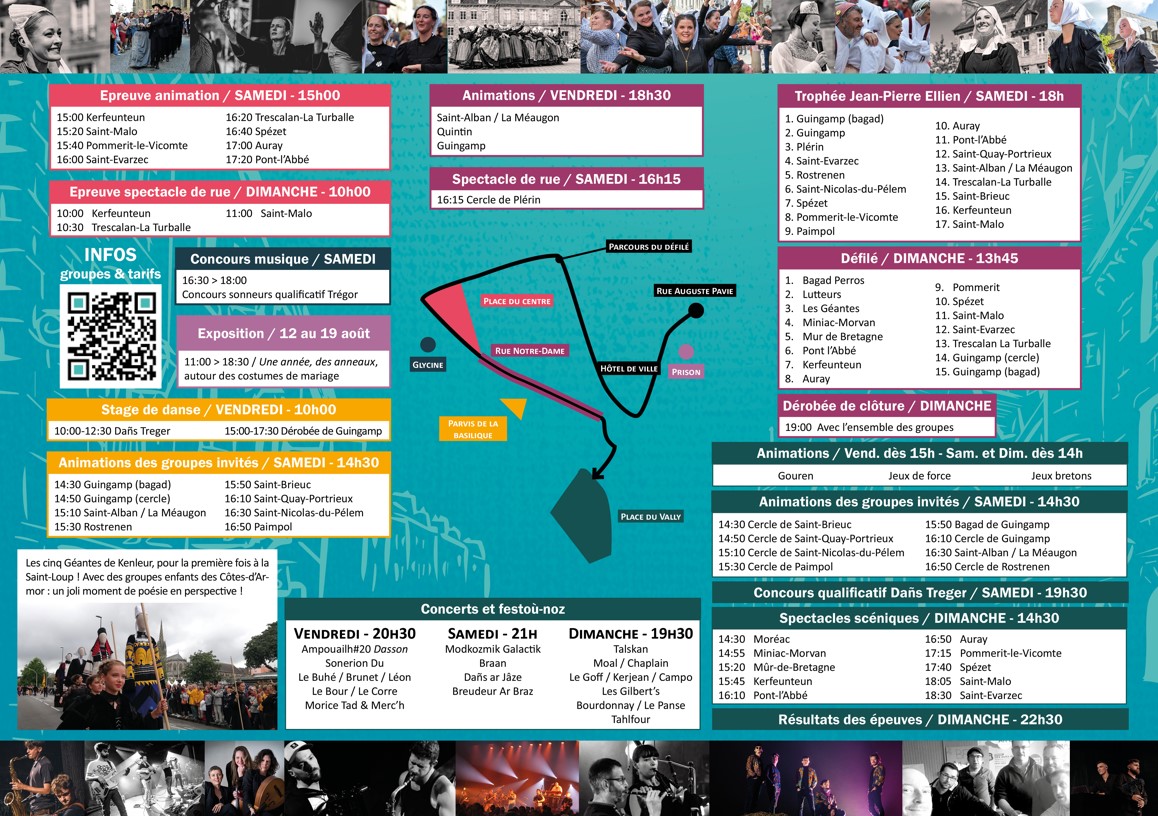 Kenleur, confédération culturelle bretonne, entend valoriser le patrimoine culturel de Bretagne par le biais du spectacle vivant. Fruit d’une étroite et ancienne collaboration, la finale du championnat national de danse bretonne trouve tout naturellement sa place dans la programmation du festival de la Saint-Loup. Sont ainsi invités à concourir à Guingamp les finalistes sélectionnés à l’issue des épreuves de printemps. Cette sélection est basée sur deux épreuves : la première, Tradi’Deiz, consiste à présenter la danse traditionnelle dans son état brut (épreuve terroir ou répertoire imposé) et un défilé. La seconde, Kenleurenn, consiste à proposer une présentation de costumes et un spectacle qui transpose la danse traditionnelle à la scène ou à la rue. Pour cette dernière, les groupes sont alors évalués suivant plusieurs critères tels que : complicité et complémentarité musiciens/danseurs, capacité à installer un climat, adéquation des costumes avec les idées véhiculées, capacité à exploiter la diversité des répertoires, cohérence du thème, symbiose avec le public…
