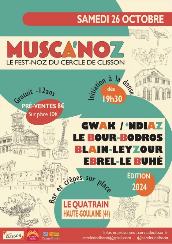 - Billetterie en ligne : https://www.helloasso.com/associations/cercle-celtique-olivier-de-clisson/evenements/musca-noz-2024-fest-noz-du-cercle-celtique-olivier-de-clisson-26-10-2024