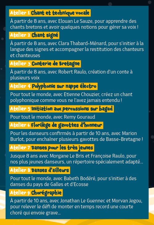 De 10h à 11h30, participez à l’atelier de votre choix, et à partir de 11h30, vous monterez sur scène pour présenter ce que vous aurez créé !