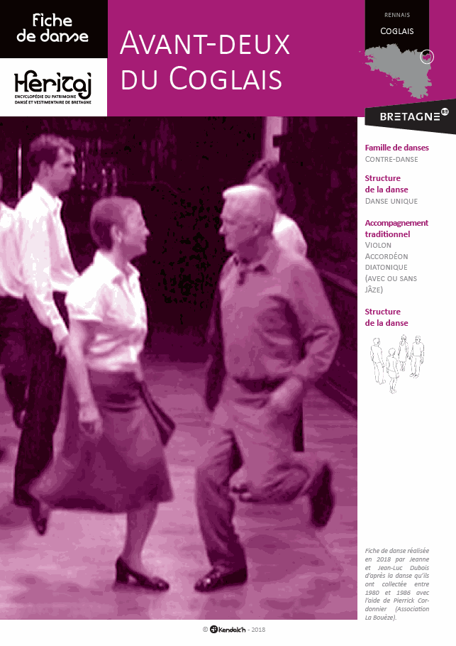 Une fiche de danse réalisée en 2018 par Jeanne et Jean-Luc Dubois d’après la danse qu’ils ont collectée entre 1980 et 1986 avec l’aide de Pierrick Cordonnier (Association La Bouèze).