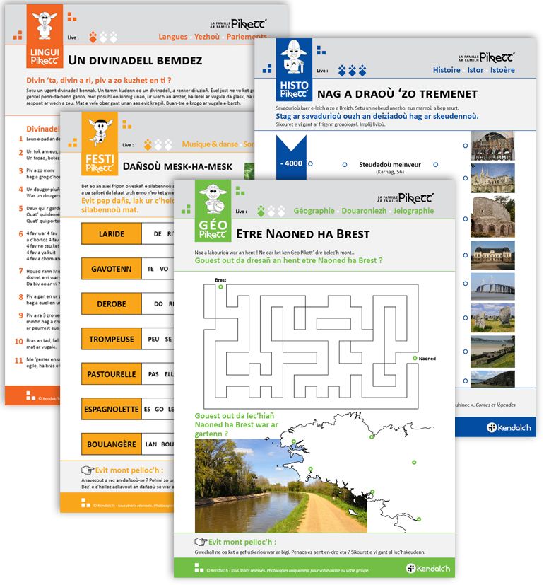 Elles fonctionnent avec le reste du coffret (classeur, posters, frise chronologique, CD…) qui lui n’existe pas tel quel en breton (mais du breton et du gallo figurent sur chacun des supports de la version originale). Idéal pour les écoles bilingues ou en immersion, ainsi que pour les cours du soir.