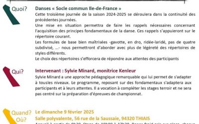 Journée de révision des danses du répertoire commun 2026. Cette journée est exclusivement ouverte aux groupes classés, à raison de deux couples maximum par groupe et aux moniteurs diplômés ou en cours de formation. Date et lieu Dimanche 14 décembre 2025 Accueil à...