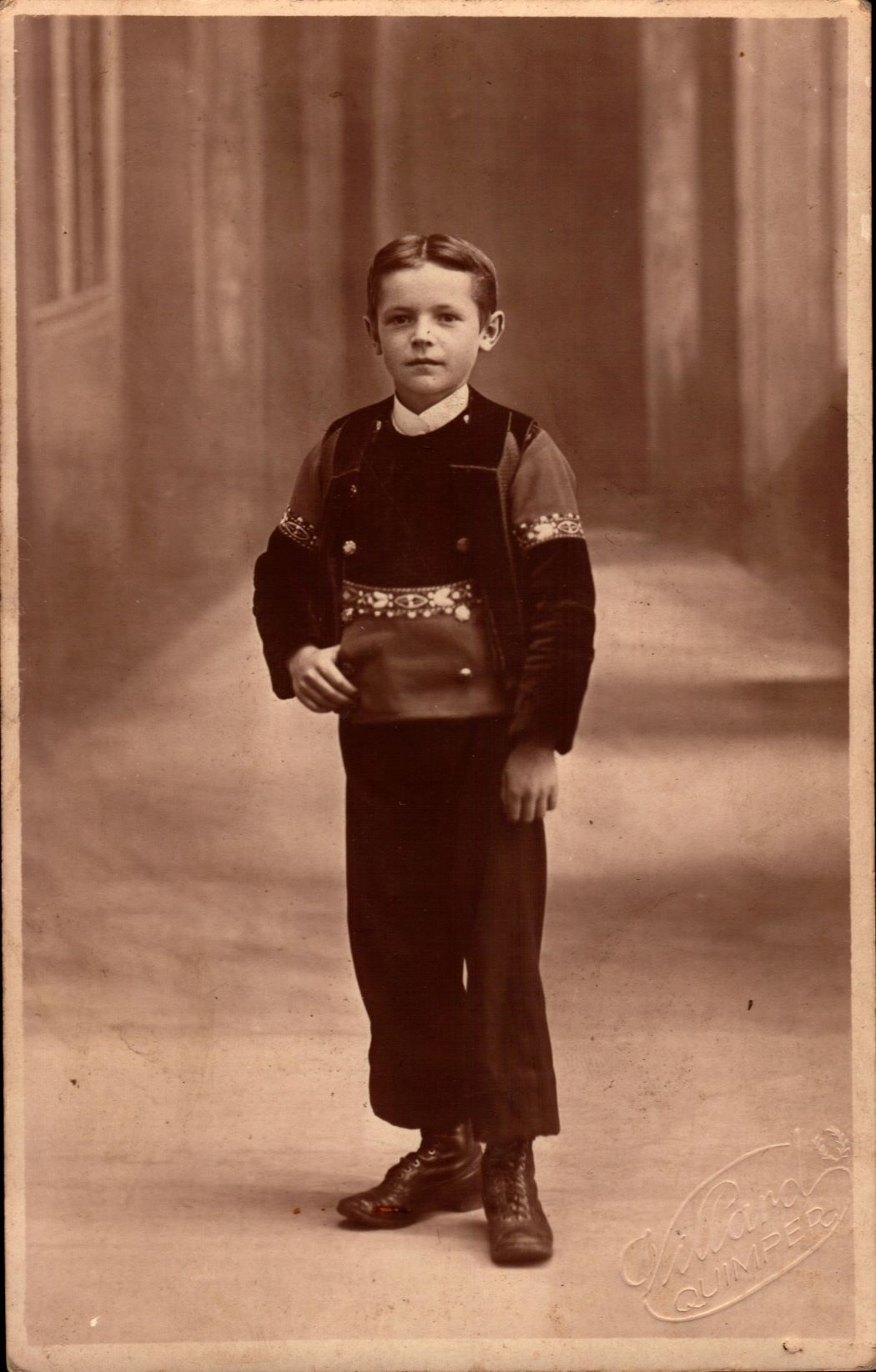 Le petit garçon sur la photo porte ce fameux costume glazik à la dernière mode avec ses bottines et le pantalon de ville. Il est issu d’une famille aisée, vu l’importance de la broderie sur son costume.