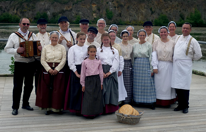 Nous portons des costumes de fête du pays nantais (robe noire, tablier, châle, et coiffes paillées pour les dames, veste noir, petit gilet, ceinture bleue, pantalon gris à rayures et chapeau pour les messieurs) et si le thème de la chorégraphie s’y prête des costumes d’artisanes jupes longues en toile épaisse unie, chemisiers à semis de petites fleurs, tabliers rayés, et une coiffe de travail paillée sans broderie. Pour les messieurs pantalons de travail en velours noir taille haute, chemises de travail fin XIXe en drap écru, ceintures de lainage gris et mouchoirs de cou.